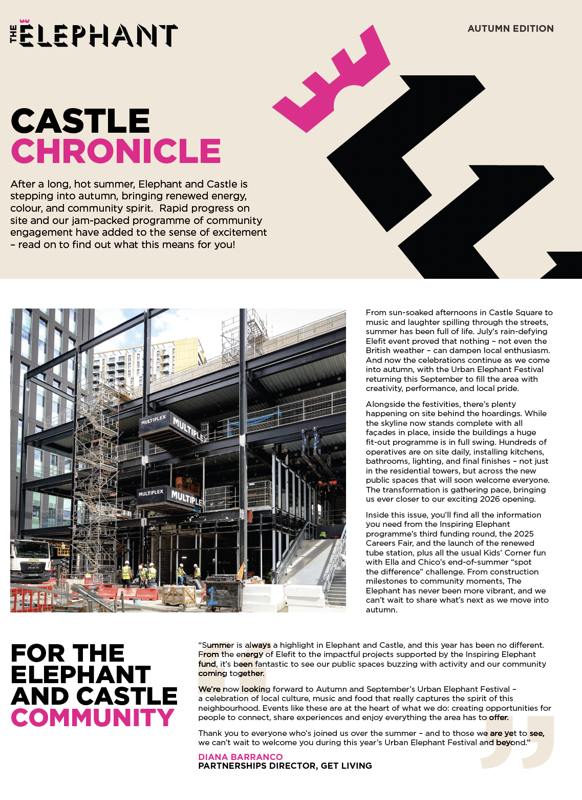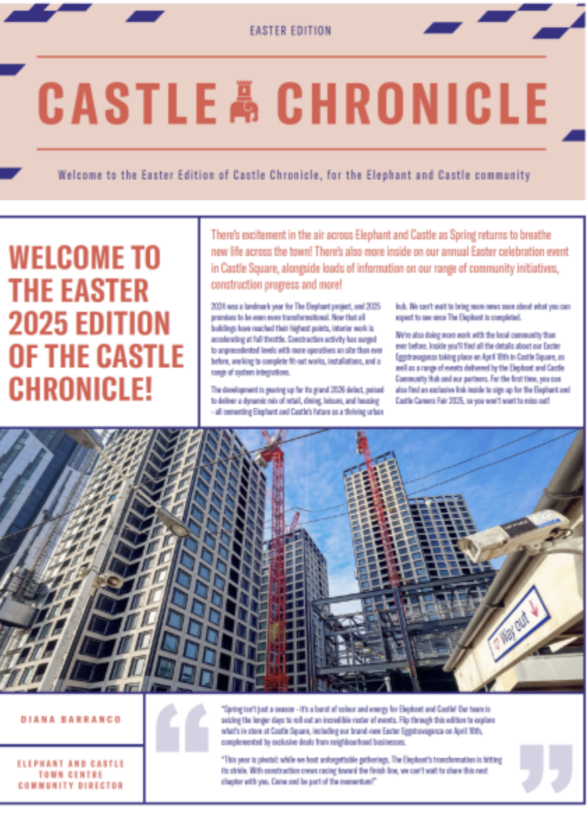 Brought to you by the Elephant and Castle Town Centre team, inside the Castle Chronicle you can read all about what’s going on in the local community, including updates on the redevelopment of the town centre.